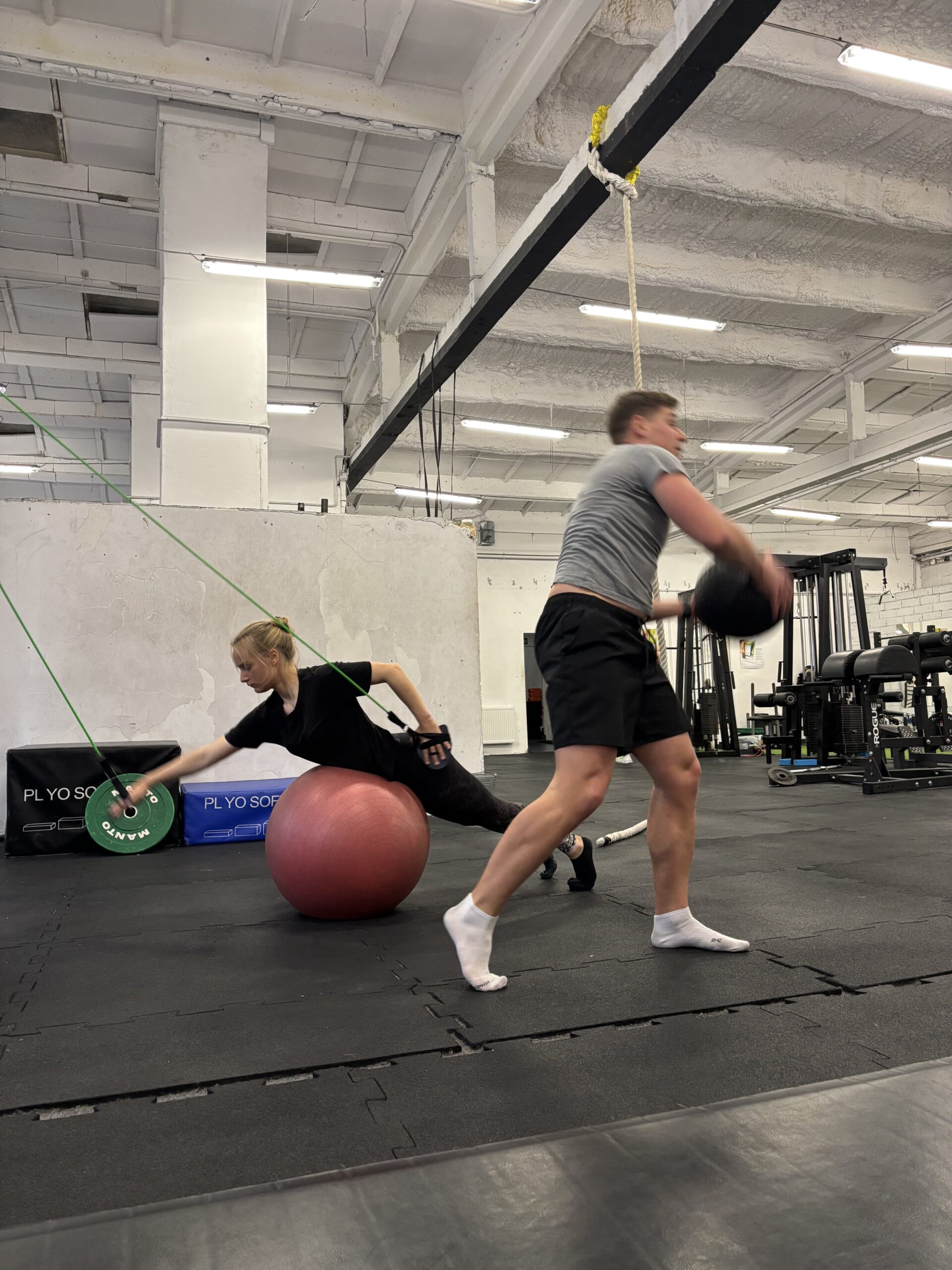 SALA READY TO SURF: Do dyspozycji grupy mamy salę treningową MOVEMENT GYM o powierzchni ok 150 m2 wyposażoną w niezbędny sprzęt do treningów siłowych. Są drążki, hantle, kettle, mnóstwo gum, ławeczki, piłki, maty do ćwiczeń.